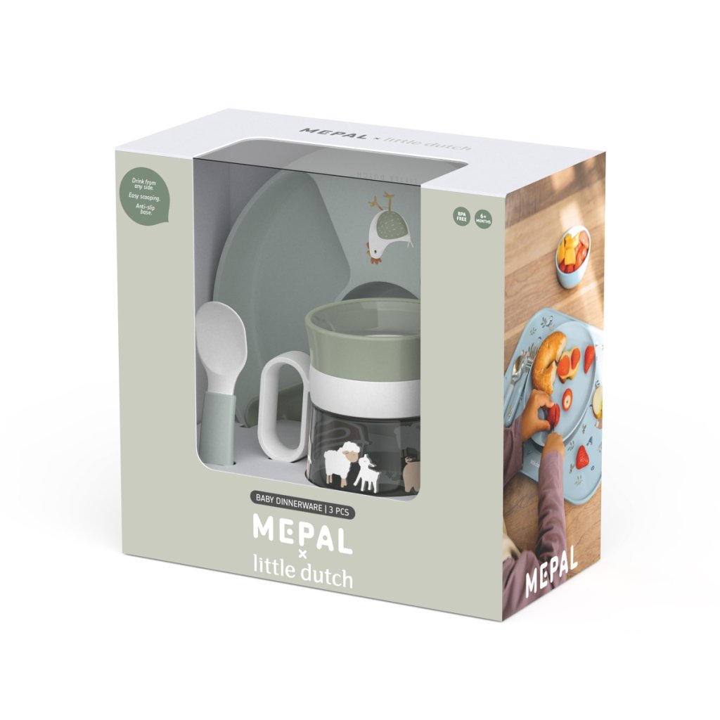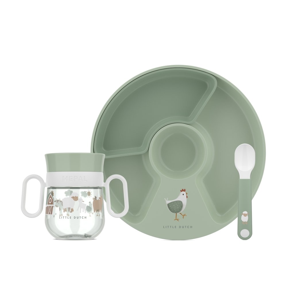 První sousta, první doušky: každé poprvé má své kouzlo. S dětským jídelním setem Mepal s motivem Little Dutch - Farma se mohou naučit samostatně jíst i ti nejmenší. Sada obsahuje trénovací hrnek s oušky, dělený talíř a trénovací lžičku. Všechny tři jsou lehké a zároveň robustní.