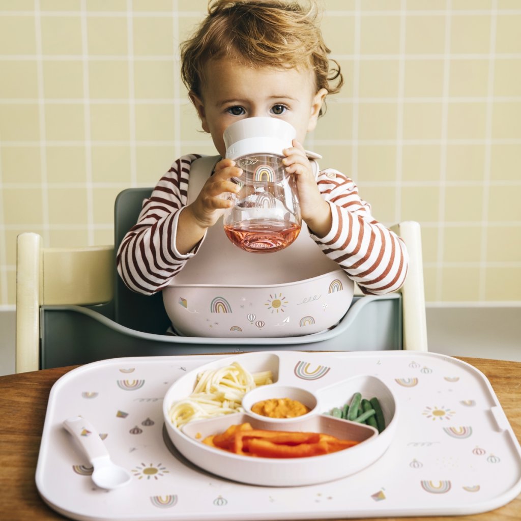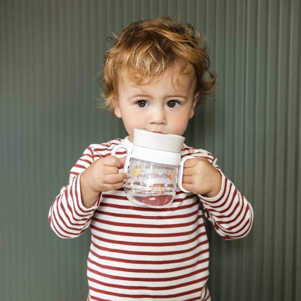Lze mýt bezpečně v myčce, nebo ručně za použití šetrného mycího prostředku. Talířek s lžičkou lze použít v mikrovlnné troubě. Pro důkladné vyschnutí skladujte trénovací hrnek bez víčka.