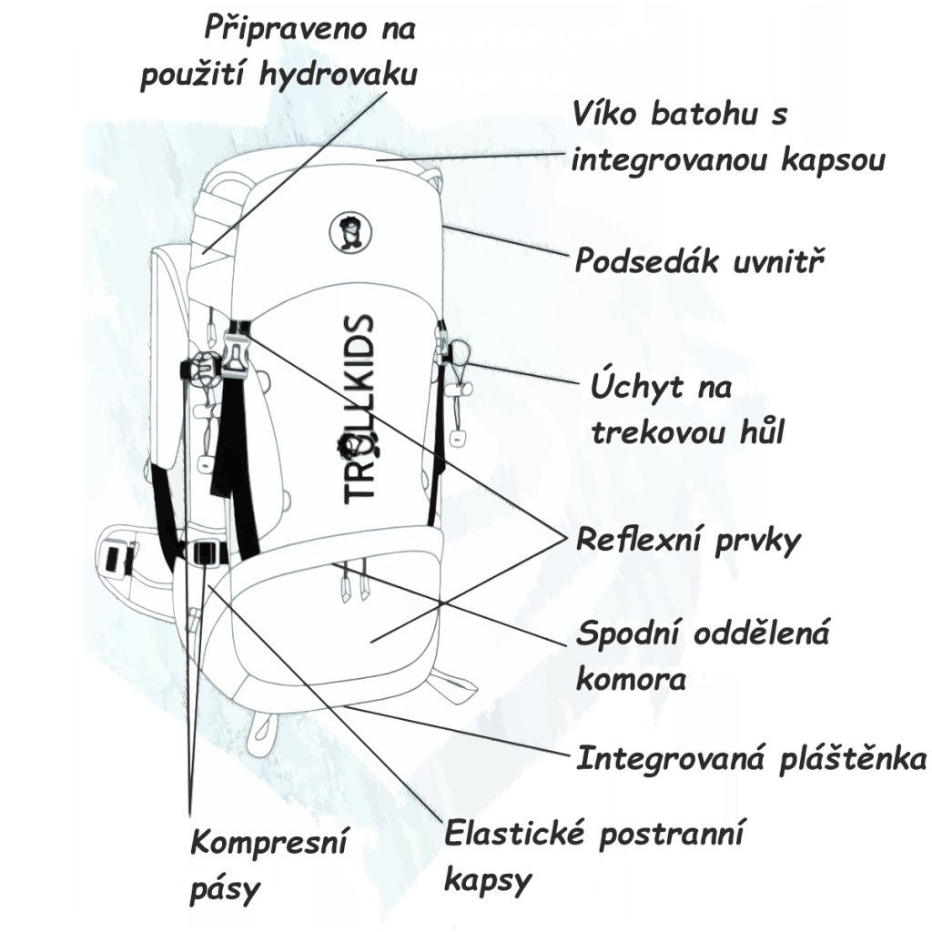 Mezi praktické vychytávky patří odnímatelný podsedák a poutka na turistické hole. Píšťalka na hrudním popruhu je šikovným pomocníkem v případě nouze. Nepromokavá pláštěnka udrží batoh i jeho obsah v suchu, pokud by pršelo. Stačí vytáhnout pláštěnku ze základny batohu a převléct ji přes celý batoh.