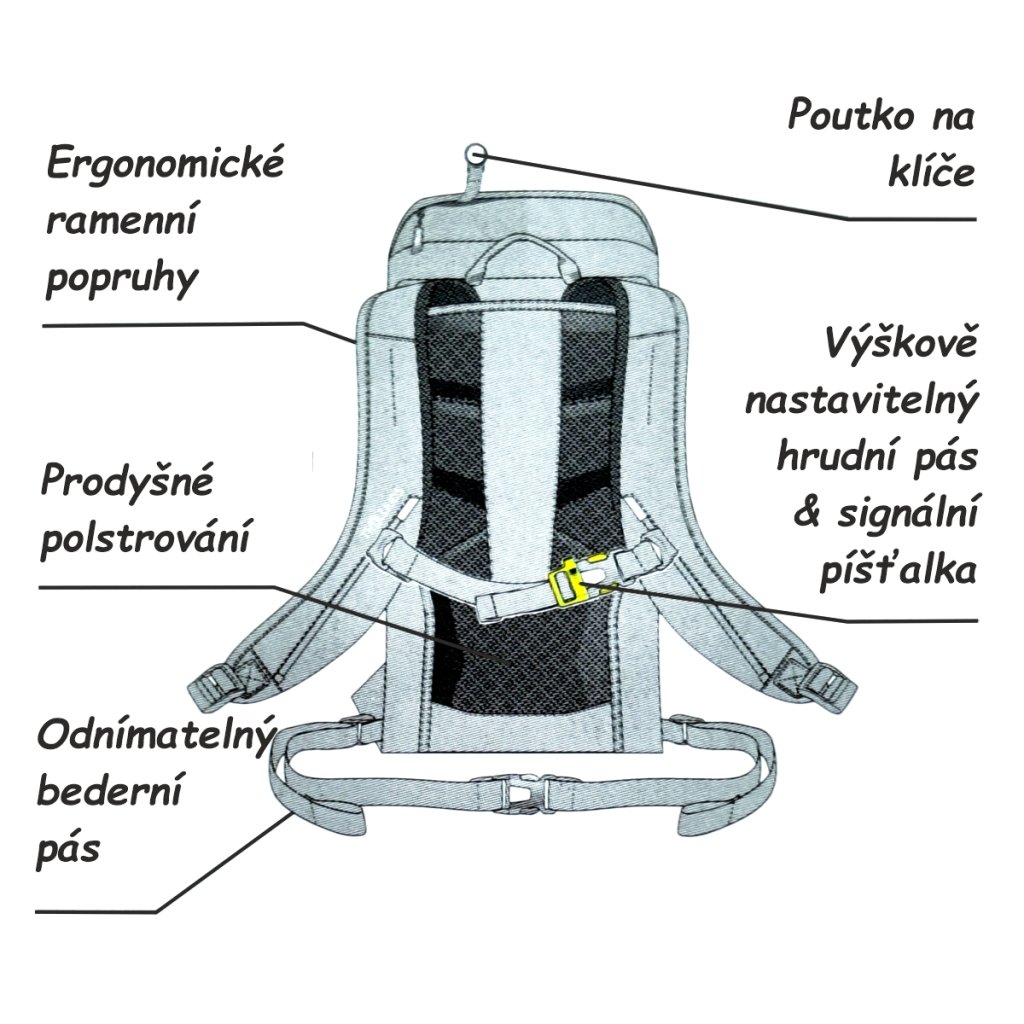 Mezi praktické vychytávky patří odnímatelný podsedák nebo pružné lanka na přední straně batohu, které lze využít na připevnění větrovky nebo kšiltovky. Nechybí dvě boční kapsy na láhve s pitím nebo rukavice. Píšťalka na hrudním popruhu je šikovným pomocníkem v případě nouze. Nepromokavá pláštěnka udrží batoh i jeho obsah v suchu, pokud by pršelo. Stačí vytáhnout pláštěnku ze základny batohu a převléct ji přes celý batoh.