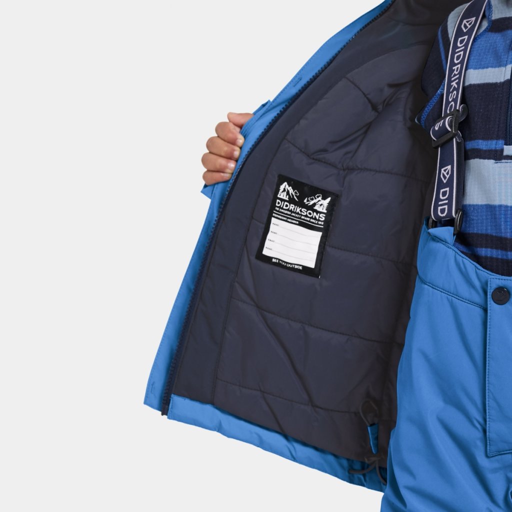 Bunda i kalhoty mají rostoucí systém Didriksons EXTEND SIZE. V rukávech i nohavicích je šev, jehož snadným vypáráním se prodlouží délka přibližně o 5 cm. Komplet tak vydrží 2 - 3 sezóny v závislosti na rychlosti růstu dítěte.