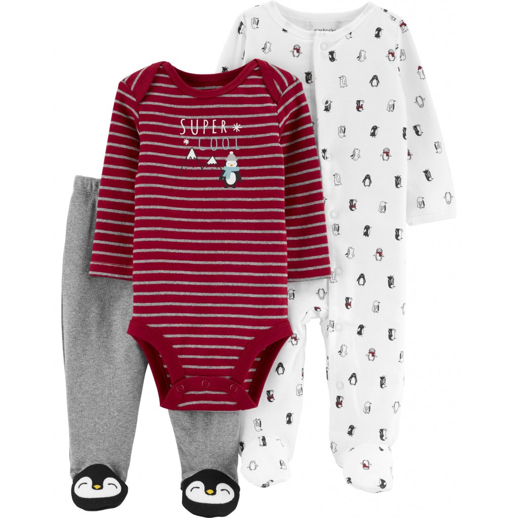 Bavlněná soupravička Carter's určená pro nejmenší miminka obsahuje pruhované body s dlouhým rukávem, jednobarevné polodupačky s tučňáky na nožičkách a overal s tučňáky se zapínáním na patentky po celé délce až ke kotníku.
