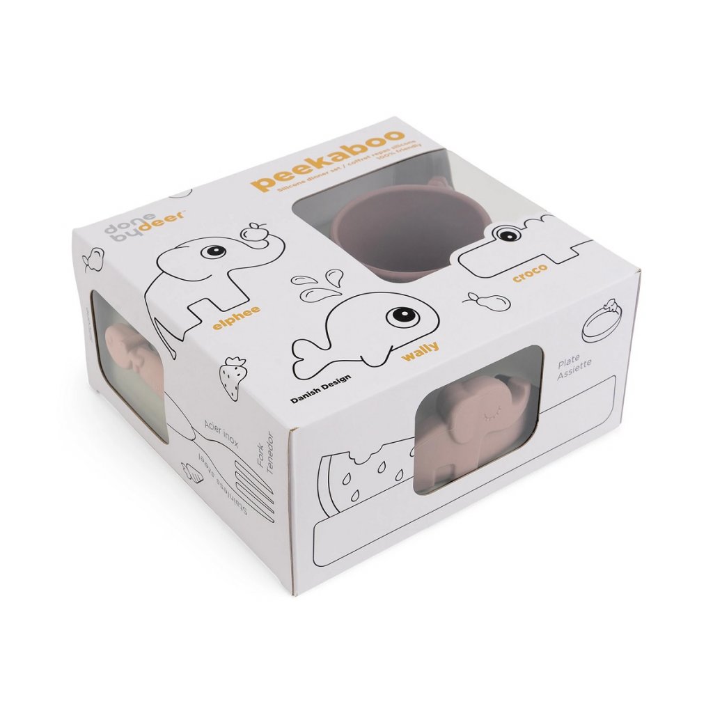 Jídelní set Peekaboo je navržen tak, aby vyvolal zvědavost malých jedlíků. Elphee, Perfektně dimenzovaná jídelní souprava pro první jídla a pro výuku vlastního krmení.