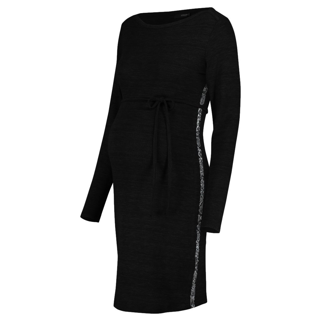 Na první pohled jsou tyto šaty jednoduché, ale pokud se podíváte pozorně, objevíte hadí potisk na boku. Šaty můžete nosit volněji nebo zvýraznit bříško pomocí stužky. Šaty jsou vyrobeny z měkkého, pružného materiálu, a proto se příjemně nosí. Tyto šaty padají těsně nad kolena.
