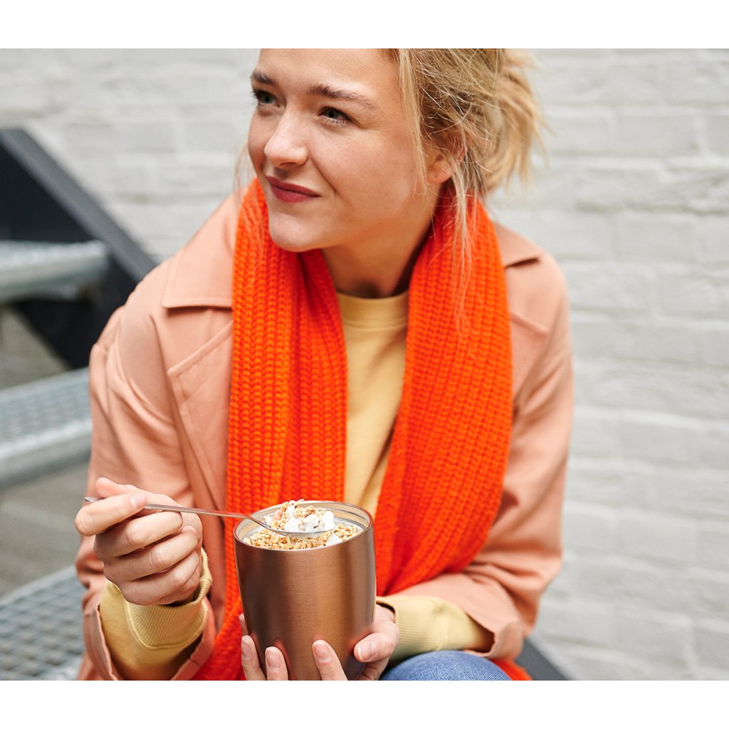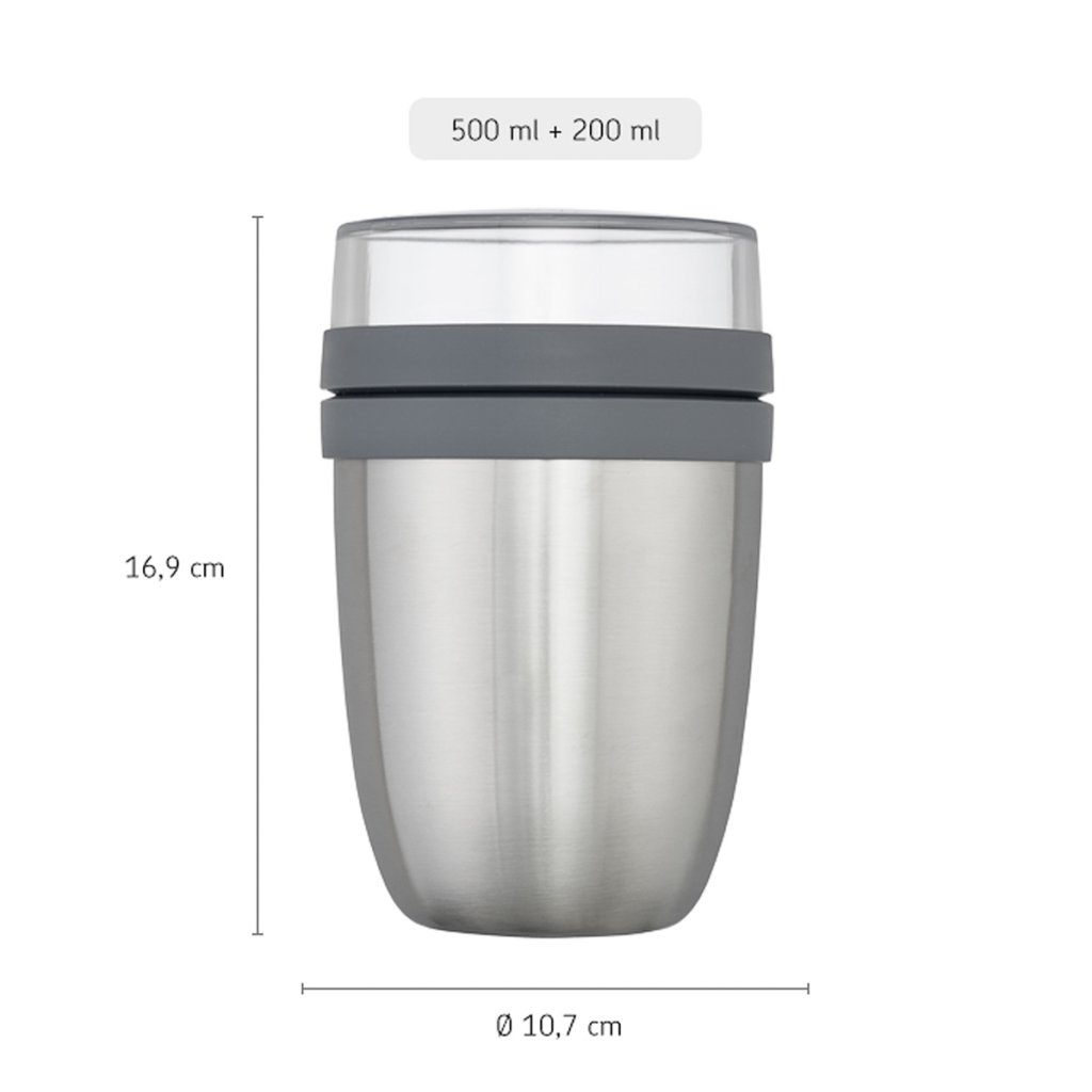 Jste každé ráno ve skluzu? Vezměte si snídani sebou v termosce na jídlo Mepal z řady Ellipse. Co takhle vychlazený jogurt s křupavým müsli? Oddělená přihrádka ve víku zajistí, že müsli zůstane hezky křupavé! Dvouplášťová nerezová termoska udrží váš jogurt vychlazený až do oběda! Snídani si můžete vychutnat ve vlaku nebo u svého stolu v kanceláři, stačí smíchat ingredience a je hotovo! Máte chuť na něco horkého, co by vás zahřálo během noční směny, přednášek nebo lekce jógy, ale nemáte k dispozici mikrovlnku? Žádný problém, ohřejte si doma polévku, nalijte ji do termosky a přidejte krutony do víka, kde zůstanou hezky oddělené. I o několik hodin později si můžete dát chutné teplé jídlo! Termoska udrží jídlo teplé po dobu 6–8 hodin (v závislosti na druhu, množství a teplotě vašeho jídla) nebo studené po dobu 12 hodin.