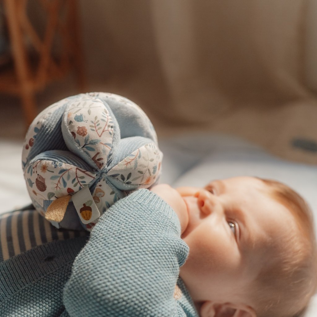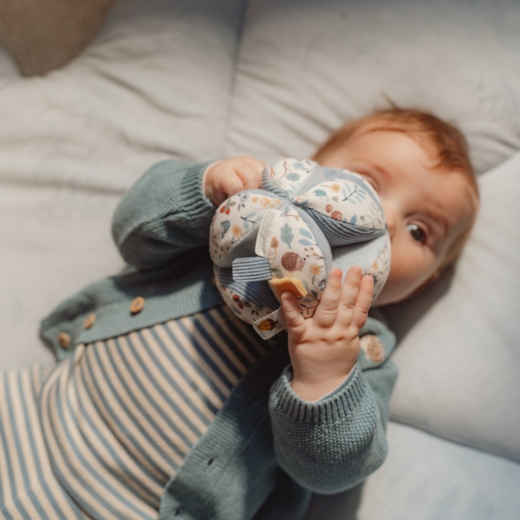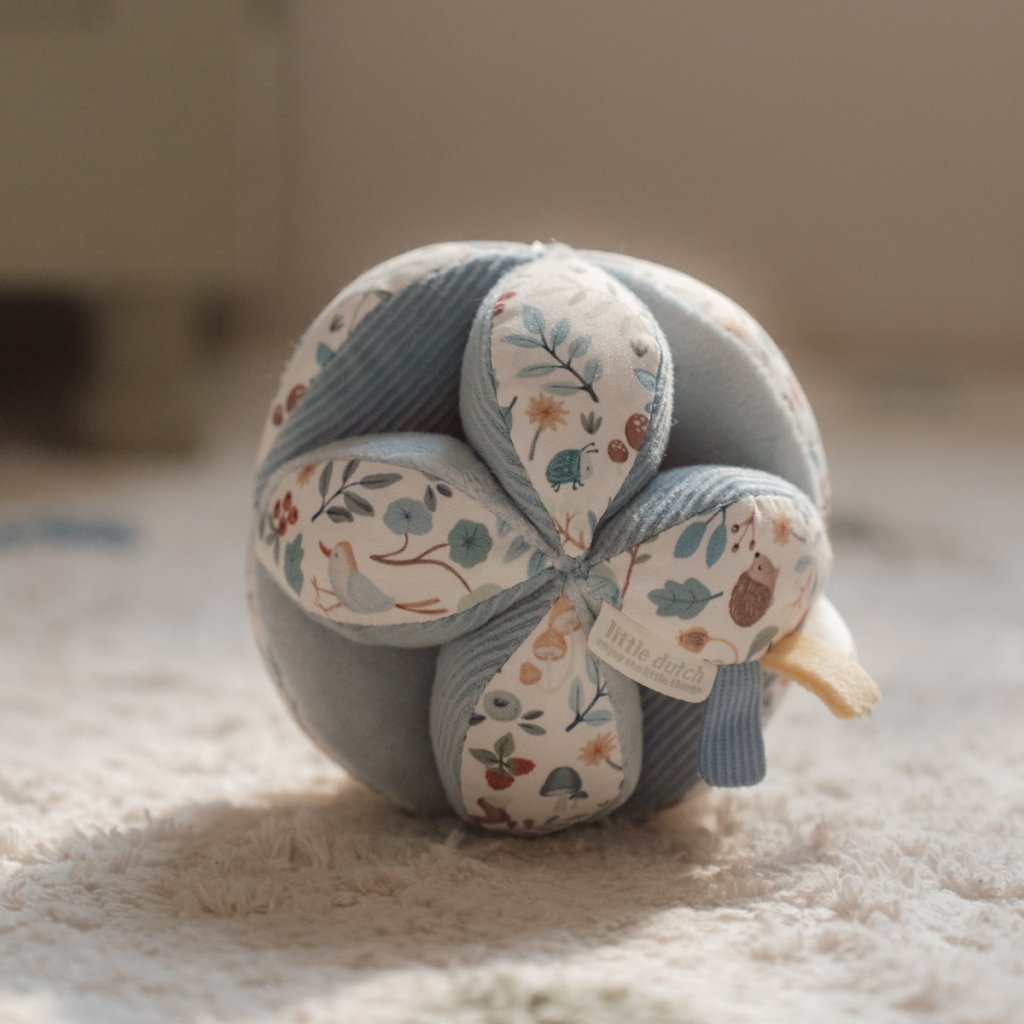 Měkký textilní míček od značky Little Dutch je díky svému provedení snadno uchopitelný malými dětskými ručičkami. Různorodé textury a vzory lákají dítě ke zkoumání, míček navíc při pohybu jemně cinká.